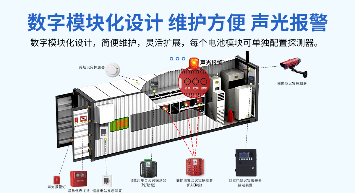 儲能多功能火災氣體探測儀器,可同時檢測煙霧、一氧化碳、氫氣、VOC、溫度 五種介質,儀表采用高性能檢測元器件和電腦微控制技術,結合先進的全自動貼裝工藝制造而成,產品兼具現場蜂鳴指示音,現場閃爍指示燈等功能,運行狀態一目了然,檢測靈敏,響應迅速; S100-ES儲能點型火災探測器采用四總線RS485的輸出方式,具有傳輸距離遠、抗干擾性好等特點。體積小巧、可直接裝于儲能集裝箱內,支持數據遠傳,實時對儲能電池柜進行全方位監測。探測火災早期特征、發出火災報警信號、防止火災蔓延和啟動自動滅火設備提供控制與指示。